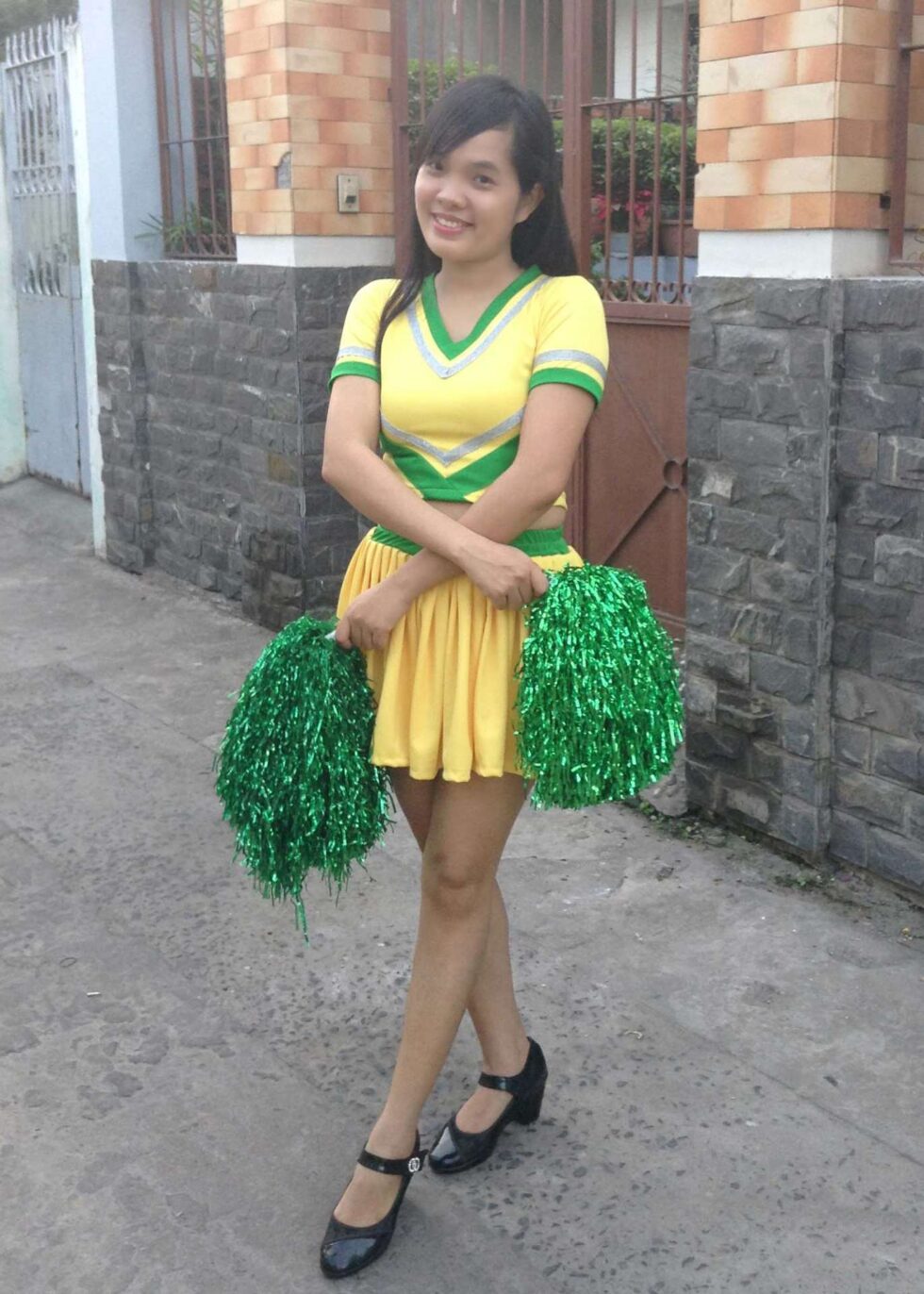 Áo váy múa cổ động vàng phối xanh lá