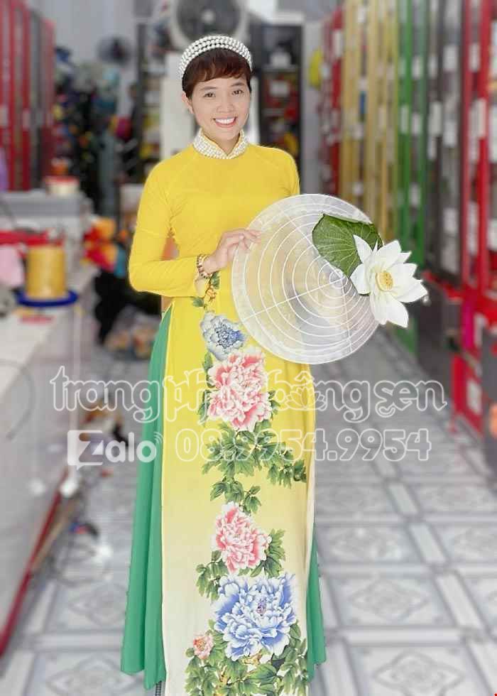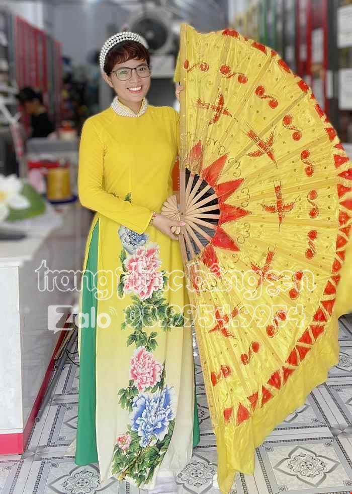 Áo dài múa quê hương đất nước, mừng Đảng, mừng Xuân. Áo dài hát múa màu xanh lá kết hoa 3D trên ngực.