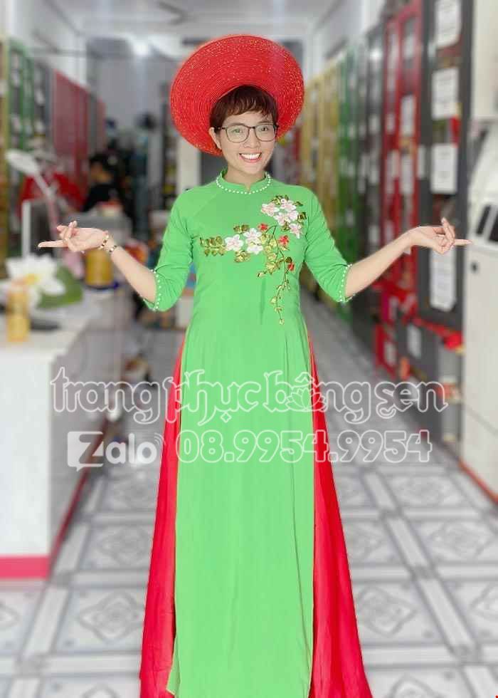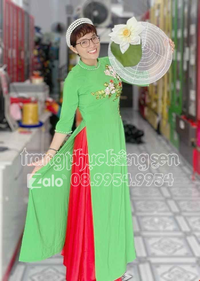 Áo dài múa quê hương đất nước, mừng Đảng, mừng Xuân. Áo dài hát múa màu xanh lá kết hoa 3D trên ngực.