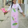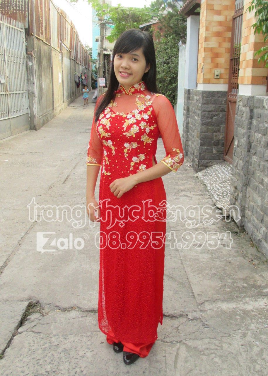 Áo dài lưới đỏ kết đá, hoa vàng