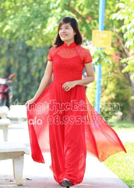 Áo dài ren đỏ tà xòe