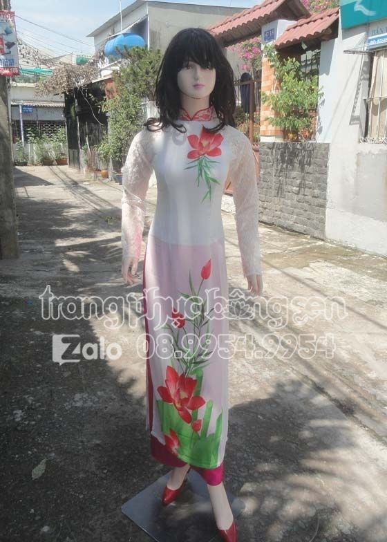 Áo dài trắng sen đỏ tay ren