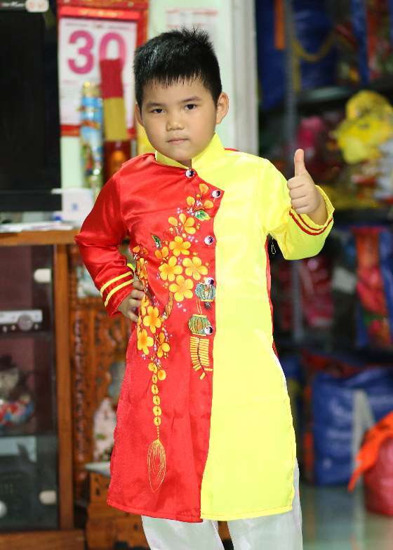 Áo dài trẻ em đỏ vàng vẽ hoa mai