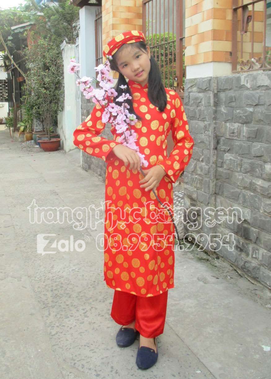 Áo dài trẻ em nữ gấm đồng tiền màu đỏ