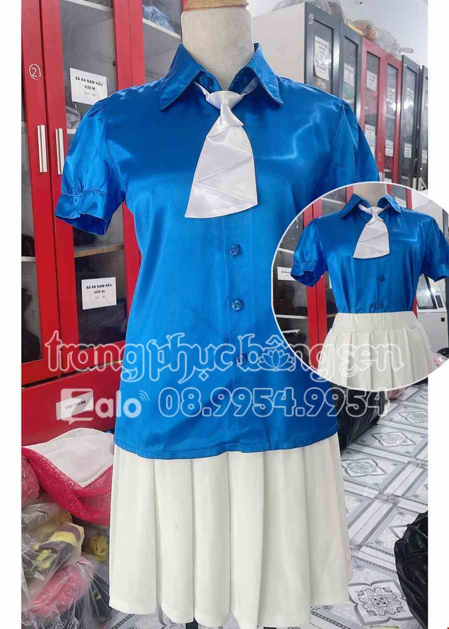 Áo sơ mi nữ xanh dương trơn váy xếp ly trắng