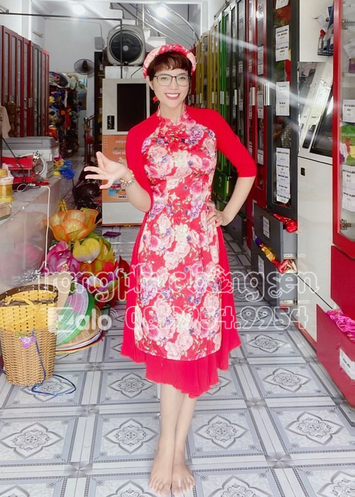 Áo dài múa quê hương đất nước, mừng Đảng, mừng Xuân. Áo dài ren đỏ kết hoa vàng.