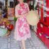 Áo dài múa quê hương đất nước, mừng Đảng, mừng Xuân. Áo dài ren đỏ kết hoa vàng.