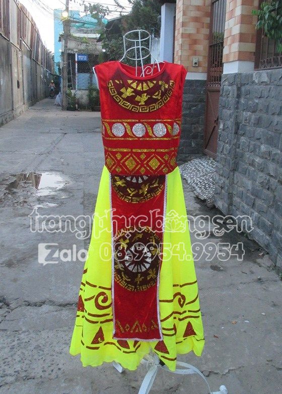 Đầm múa Âu Lạc nhỏ thân nhung đỏ váy vàng