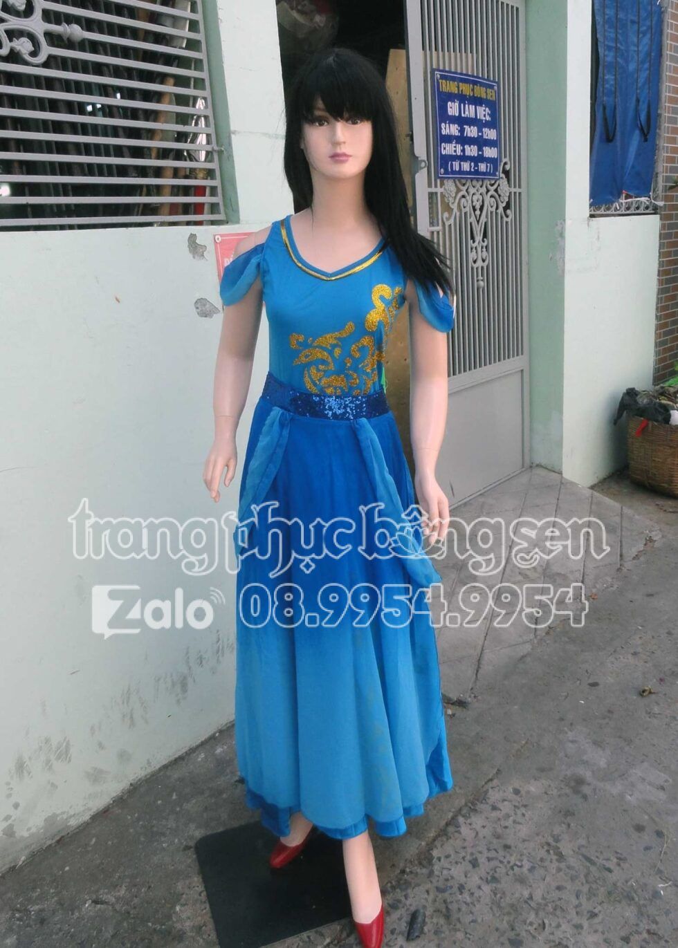 Đầm múa hiện đại xanh biển áo đai dài rời