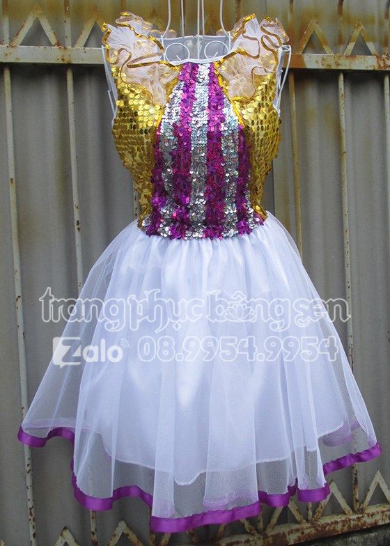 Đầm múa ngang gối kim sa sọc tím – vàng