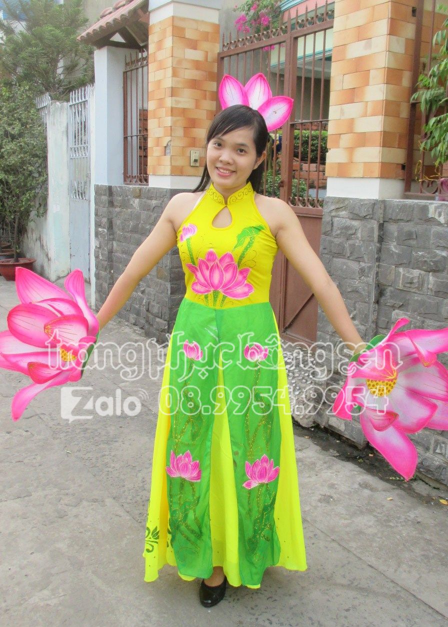 Đầm múa sen vàng, cổ trụ, 2 tà xanh