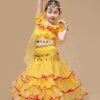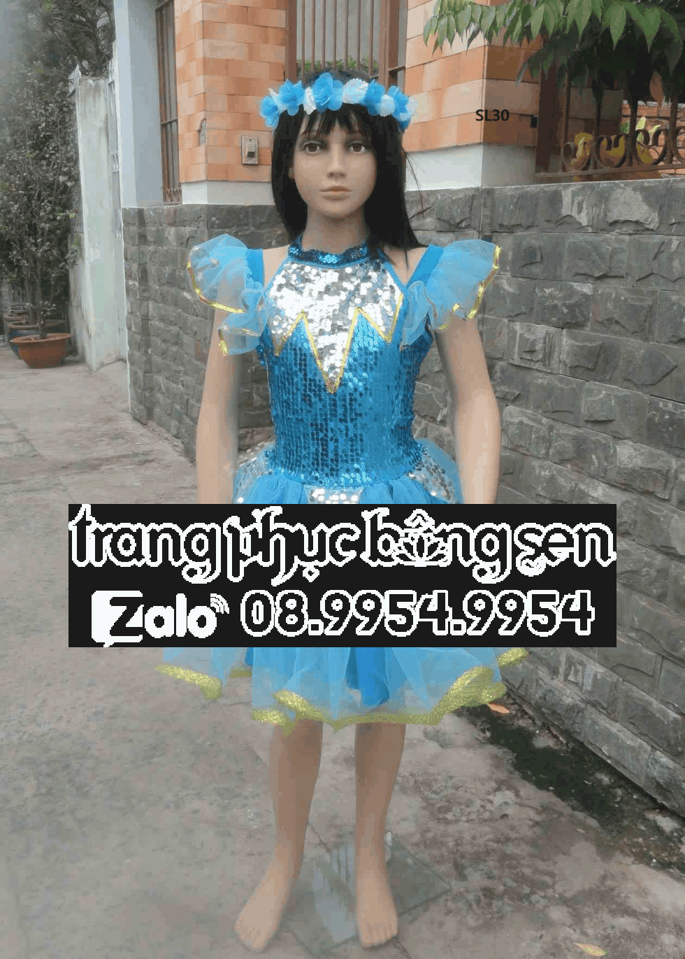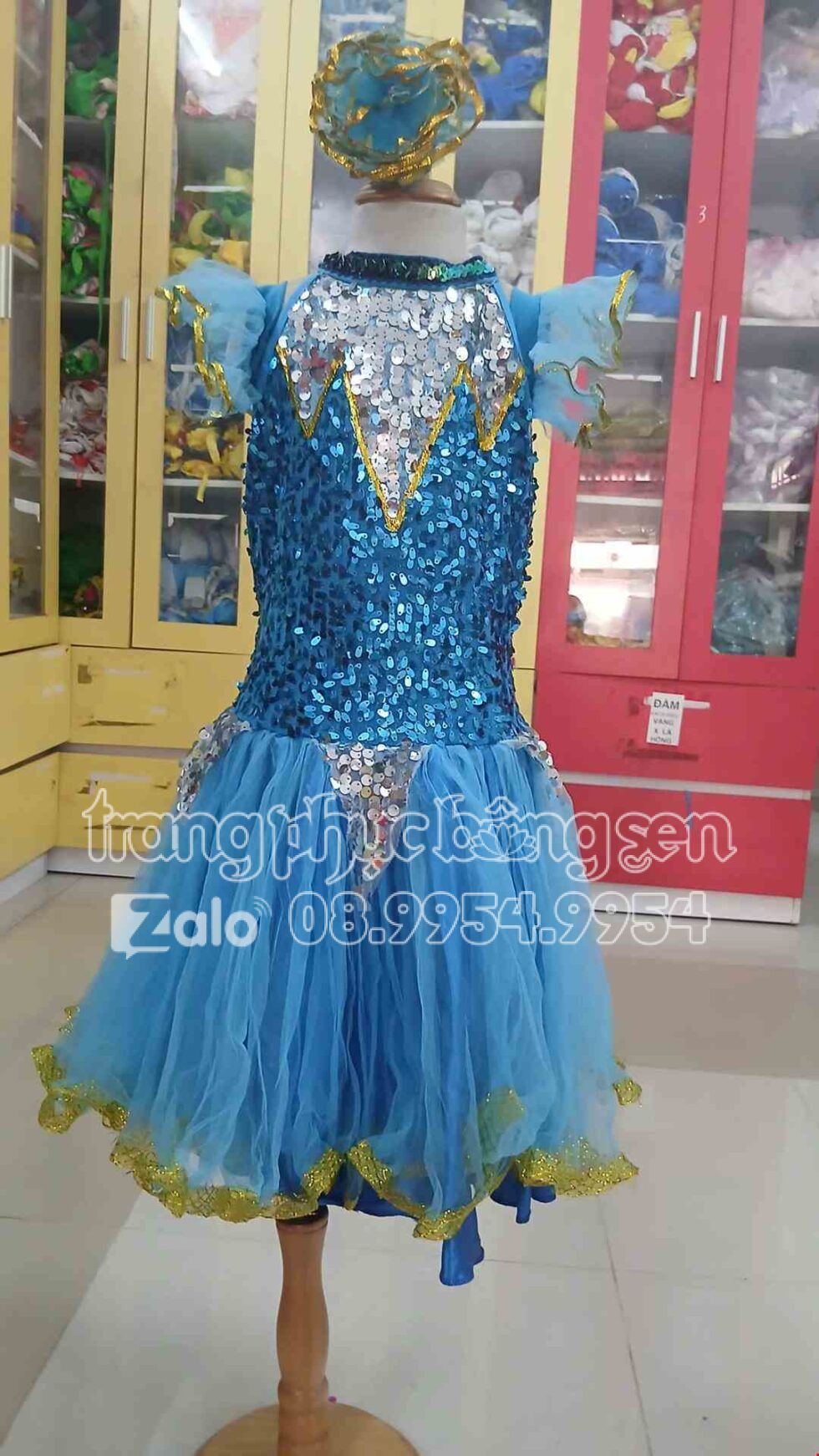 Đầm múa trẻ em kim sa xanh biển cổ trụ
