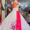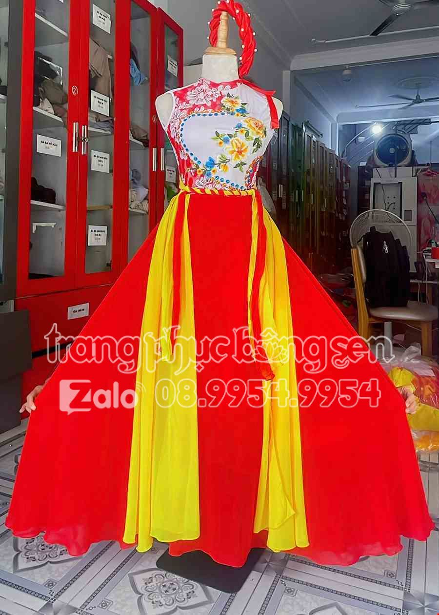 Đầm váy múa hát đỏ vàng dán đá vòng ngực