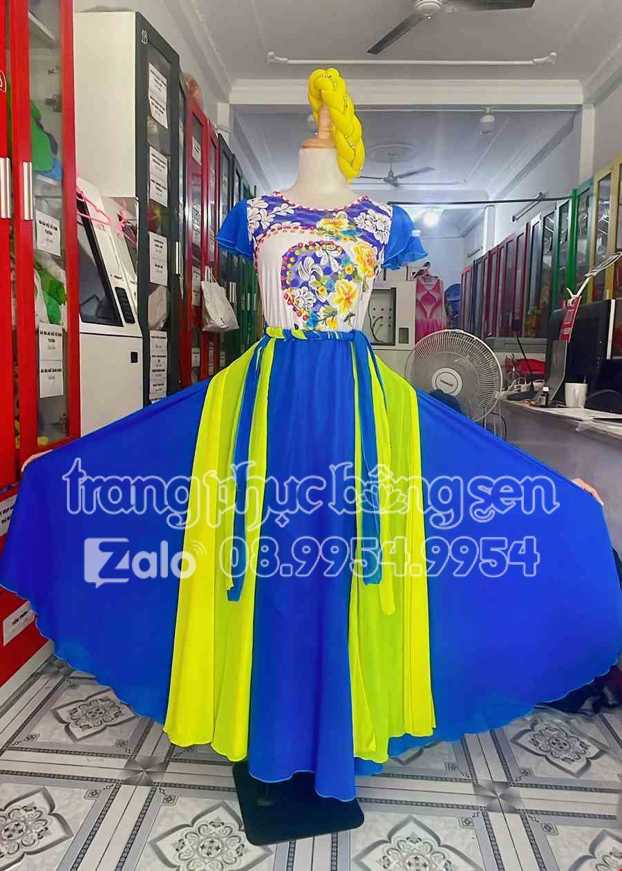 Đầm váy múa hát xanh dương, vàng, dán đá vòng ngực