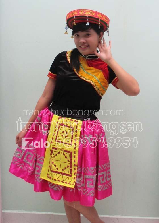 Đồ dân tộc Mèo áo nhung đen-vàng, váy phi hồng in phun