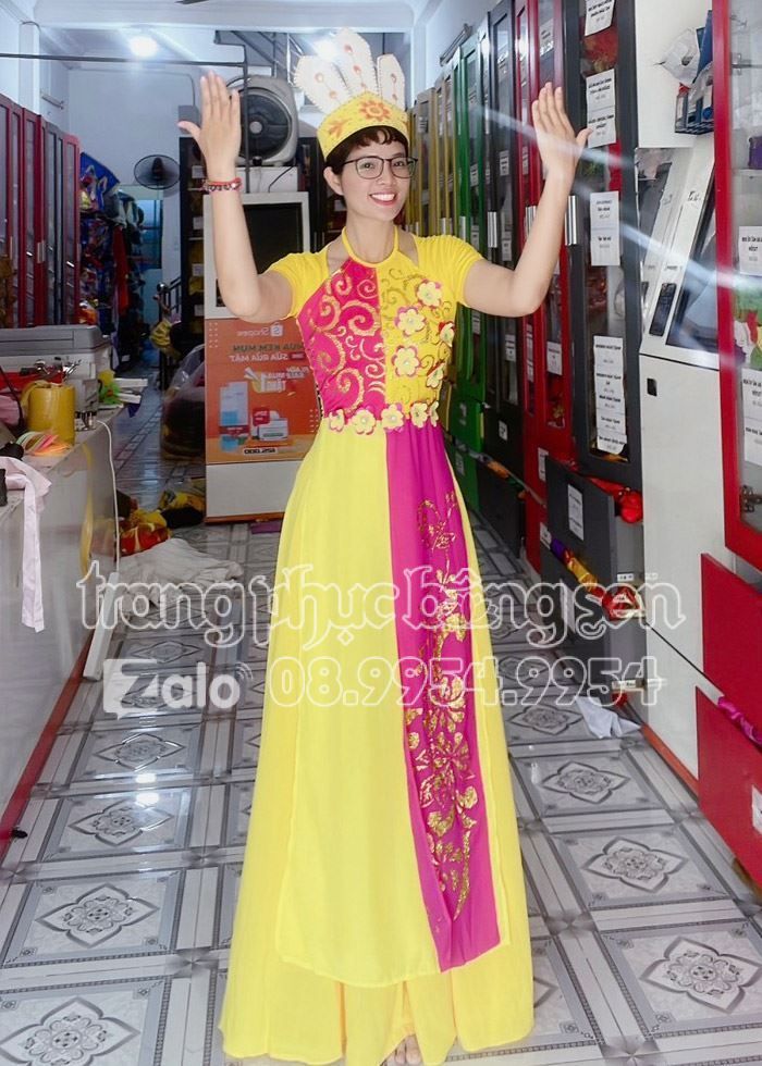 Đồ múa hát Âu Lạc: áo dài yếm, tà đắp hoa dán vàng hồng