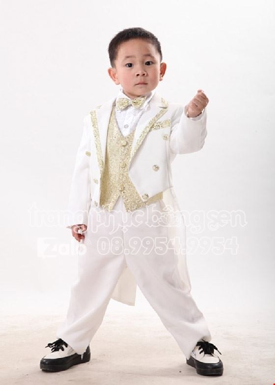 Gồm áo vest ngoài, áo lót trong, quần và nơ. Có size từ 1.2m đến 1.6m.