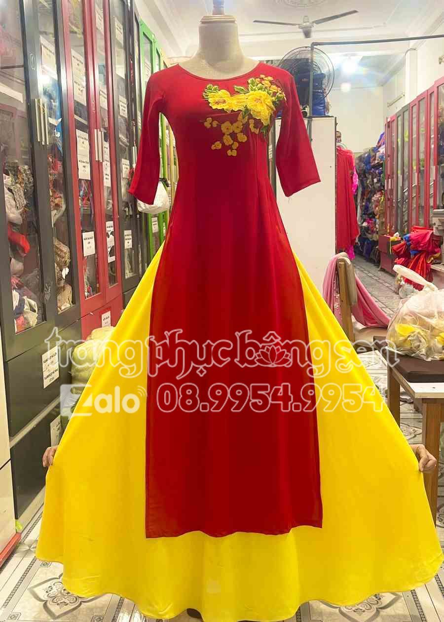 Trang phục áo dài truyền thống chiffon đỏ kết hoa 3D vàng