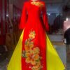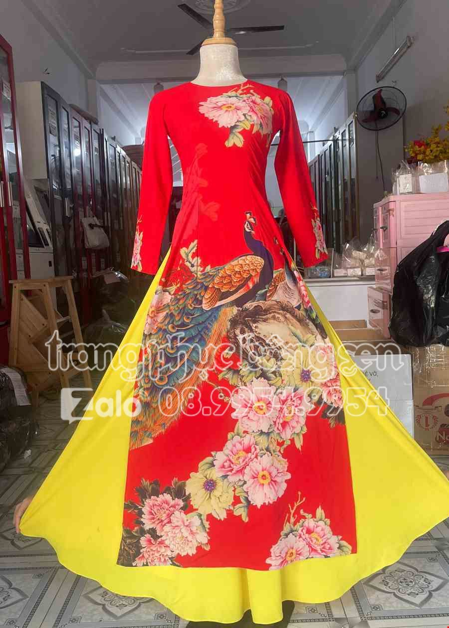 Trang phục áo dài truyền thống lụa đỏ in chim công