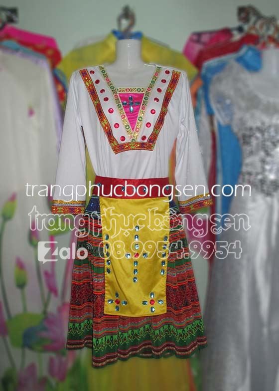 Trang phục dân tộc Mèo áo thun trắng cổ chữ V phối thổ cẩm