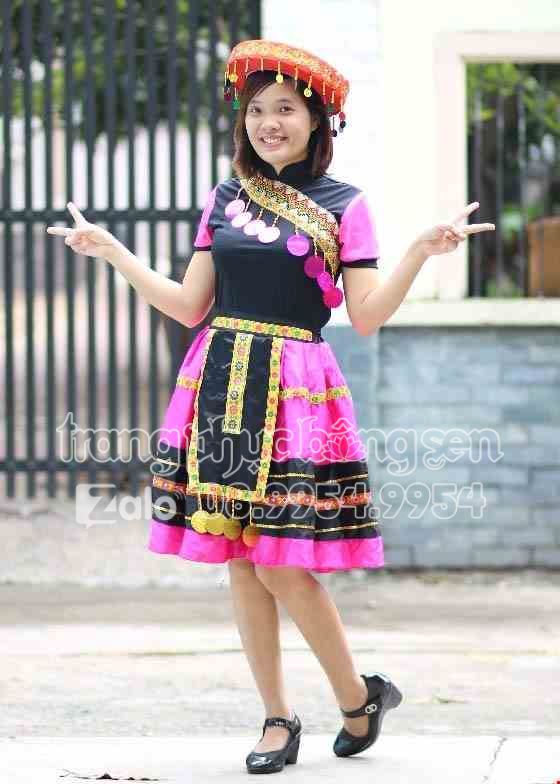 Trang phục dân tộc Mèo hồng váy hồng sọc đen phối thổ cẩm