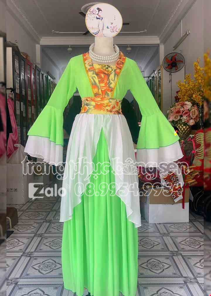 Bộ gồm áo, váy, chuỗi ngọc đội đầu và quạt.