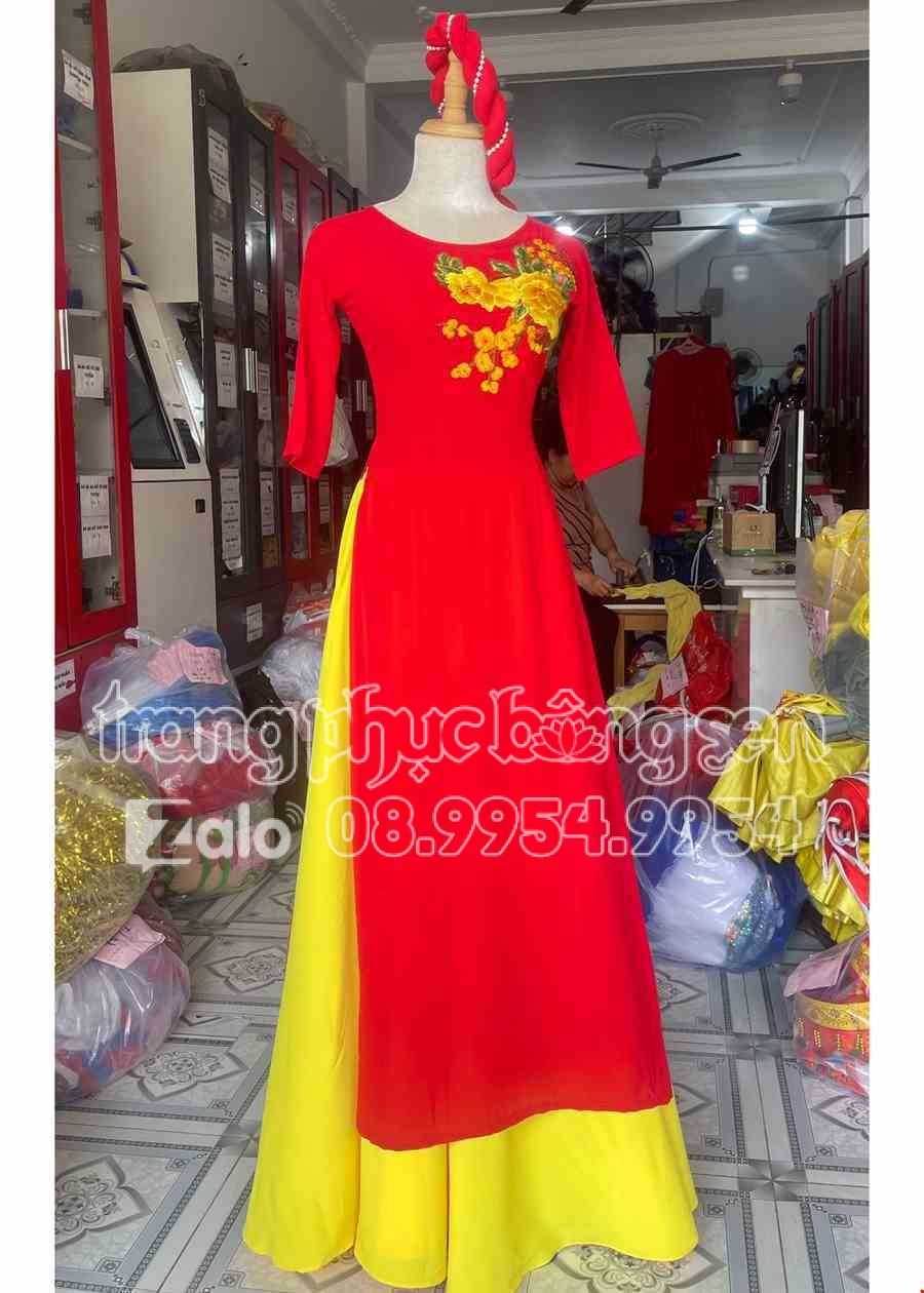 Trang phục hát múa áo dài lụa đỏ cổ tròn tay lỡ, ngực hoa 3D