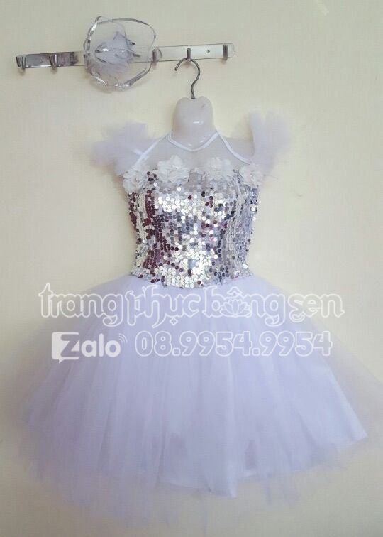 Váy múa trẻ em kim sa trắng kết hoa trắng