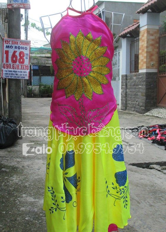 Gồm áo yếm vàng, mặc kết hợp với váy đụp màu xanh lá.