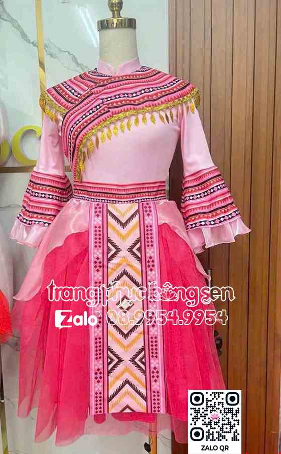 Trang phục dân tộc Mèo hồng váy hồng sọc đen phối thổ cẩm